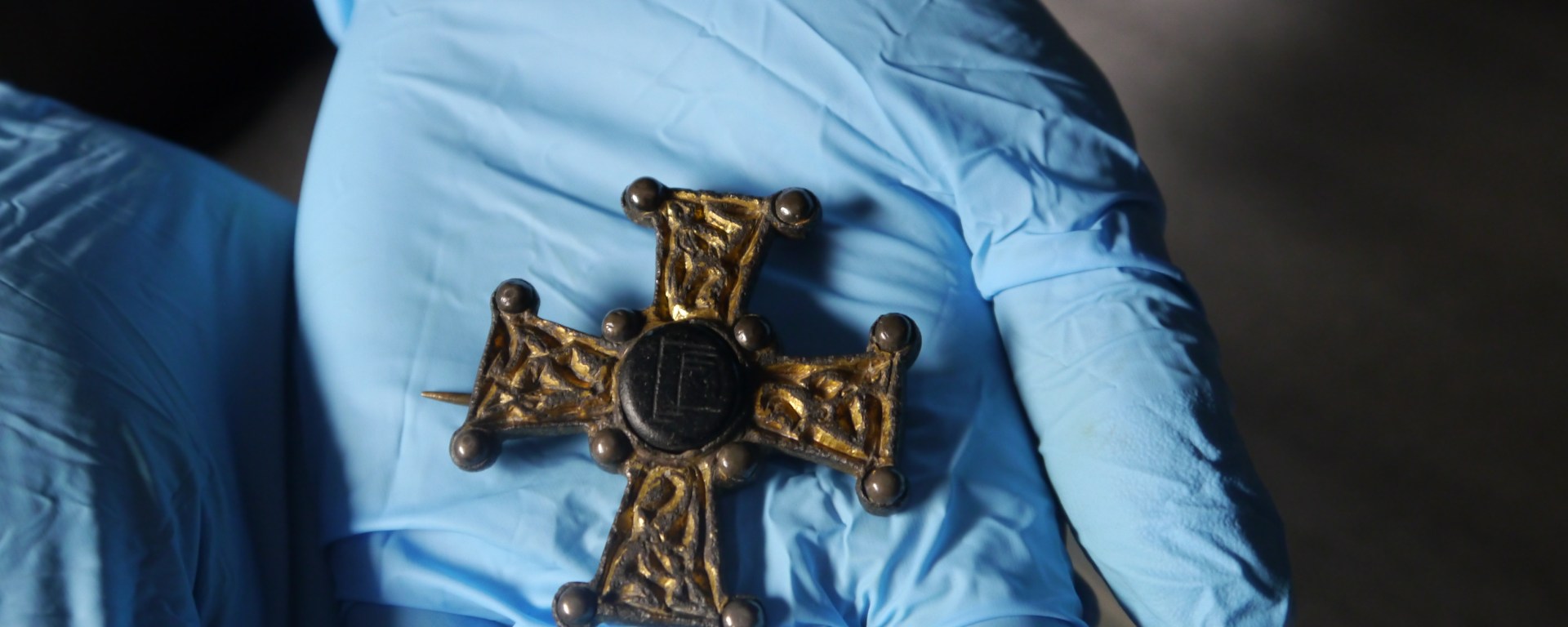 But it’s a strange thing – a hybrid around an oblong glass bead with an Arabic inscription in praise of Allah forming two lines along the length of the bead. The glass came all the way from the Middle East to western Europe, and was placed at the centre of a gilded copper alloy cross. A composite object that was found in Ireland.
